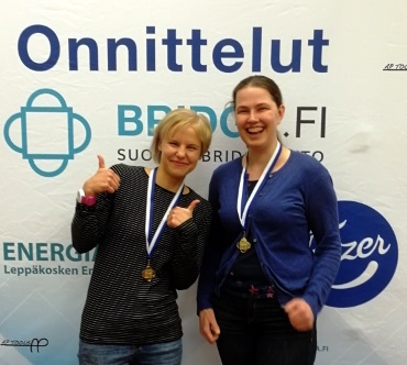 Kilpailun voittivat tamperelais-helsinkiläinen pari Meri Korhonen (Tammerbridge)ja Anni Mäkelä (Salon BK). Mitaleiden jaossa pari oli erittäin ylllättynyt ja iloinen kun kultamitalistit julistettiin!