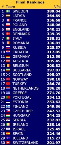 Ruotsin voitokas nelikko pelasi kilpailun noin 13,42 voittopisteen keskiarvolla. Joukkueen pelaajat olivat Sanna CLEMENTSSON, Simon EKENBERG, Ida GRONKVIST ja Mikael GRONKVIST.