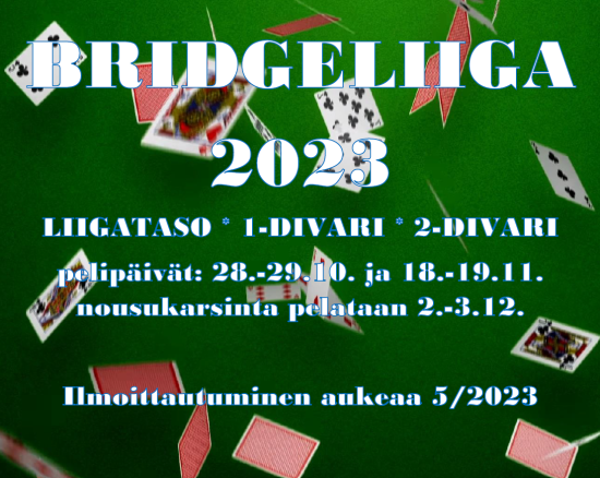 • Bridgeliigan 2023 pelipäivät ovat: 28.-29.10. ja 18.-19.11. Nousukarsinta pelataan 2.-3.12. Realbridge alustalla.