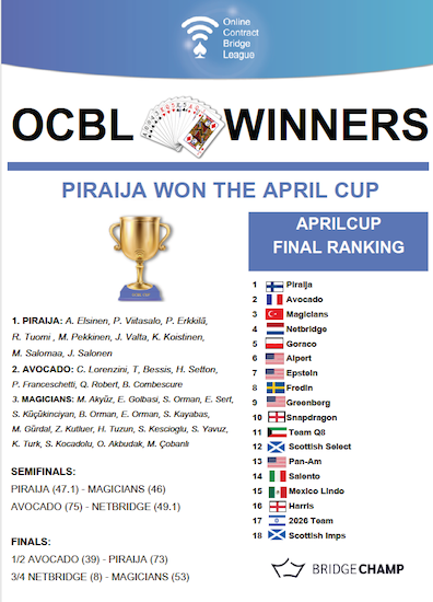 Suomalaisjoukkue Piraija on voittanut OCBL:n (Online Contract Bridge League) kansainvälisen huhtikuun cup-turnauksen.